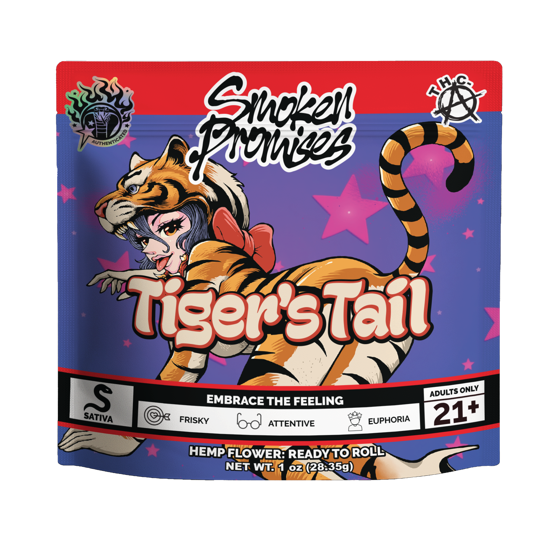 Tiger's Tail is for the prowlers who refuse to be tamed. It’s a full ounce of ready-to-roll flower designed for those who live life on the edge. This energizing sativa blend hits with a fierce, uplifting energy that sharpens your instincts and leaves you feeling dangerously alive. It’s a raw, unfiltered spark that keeps you attentive while fueling your frisky impulses. Expect a playful, euphoric lift that sharpens your focus and sparks a creative edge. With its sweet aromatic flavor, every puff delivers a delicious pounce that keeps your senses sharp and your tail wagging.