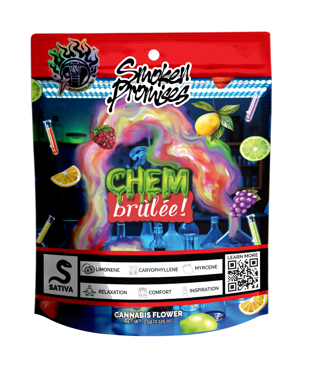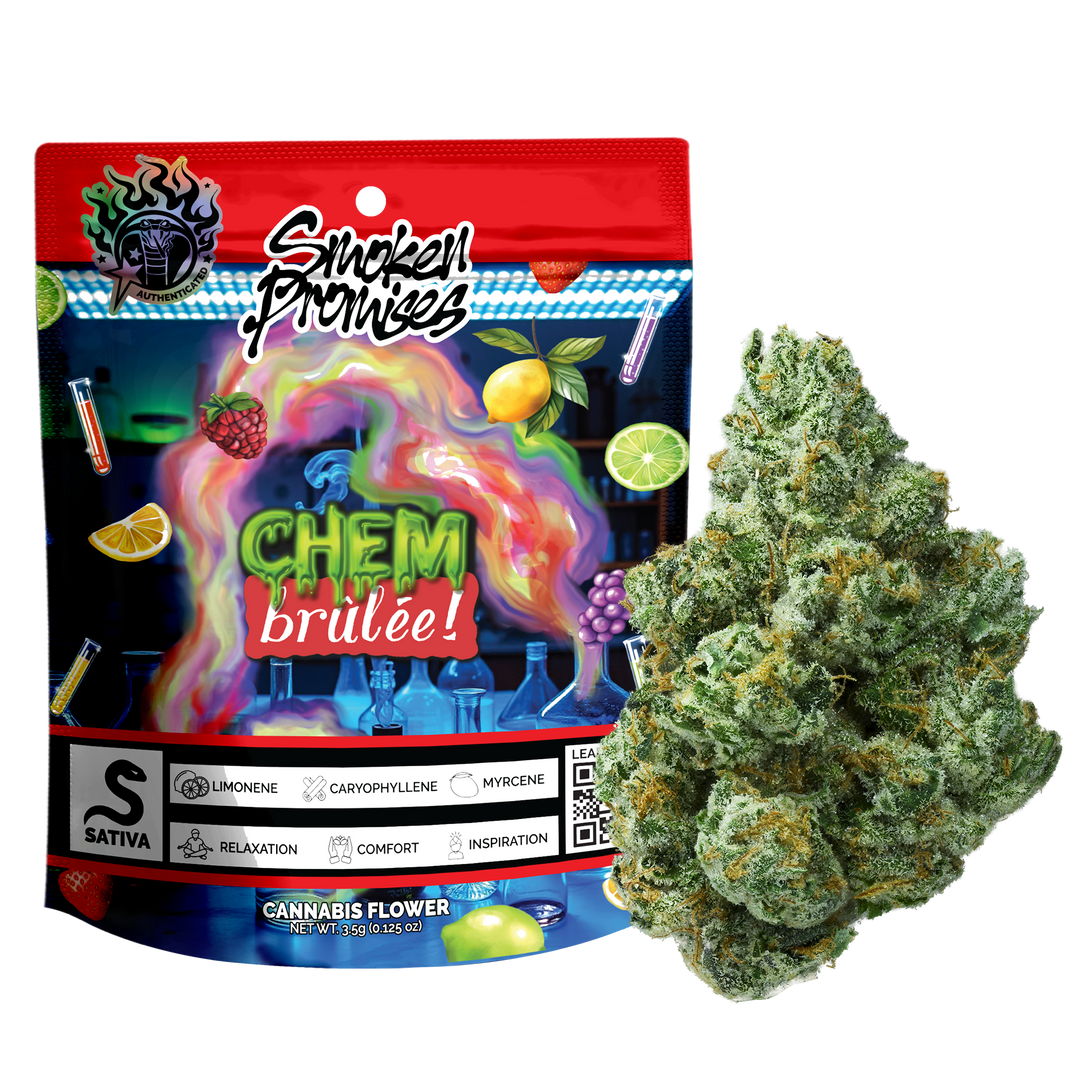 Experience Chem Brûlée, a dynamic strain crafted by our mad scientists. With its rainbow hues and gassy aroma that playfully stings the nose, this strain delivers a silky smooth smoke reminiscent of a classy dessert. Embrace relaxation, comfort, and inspiration as this sativa uplifts your spirits. Perfect for sparking creativity or unwinding after a long day, Chem Brûlée is your ticket to a blissful escape that leaves you ready to experiment!
