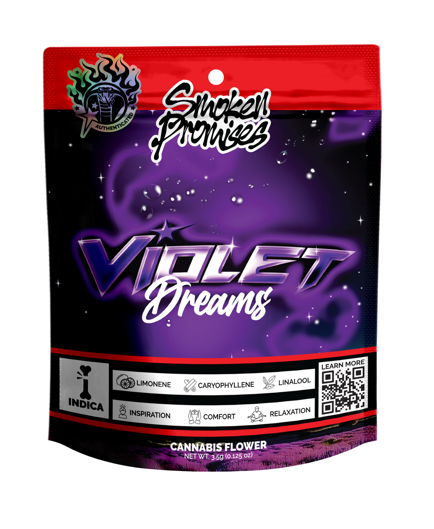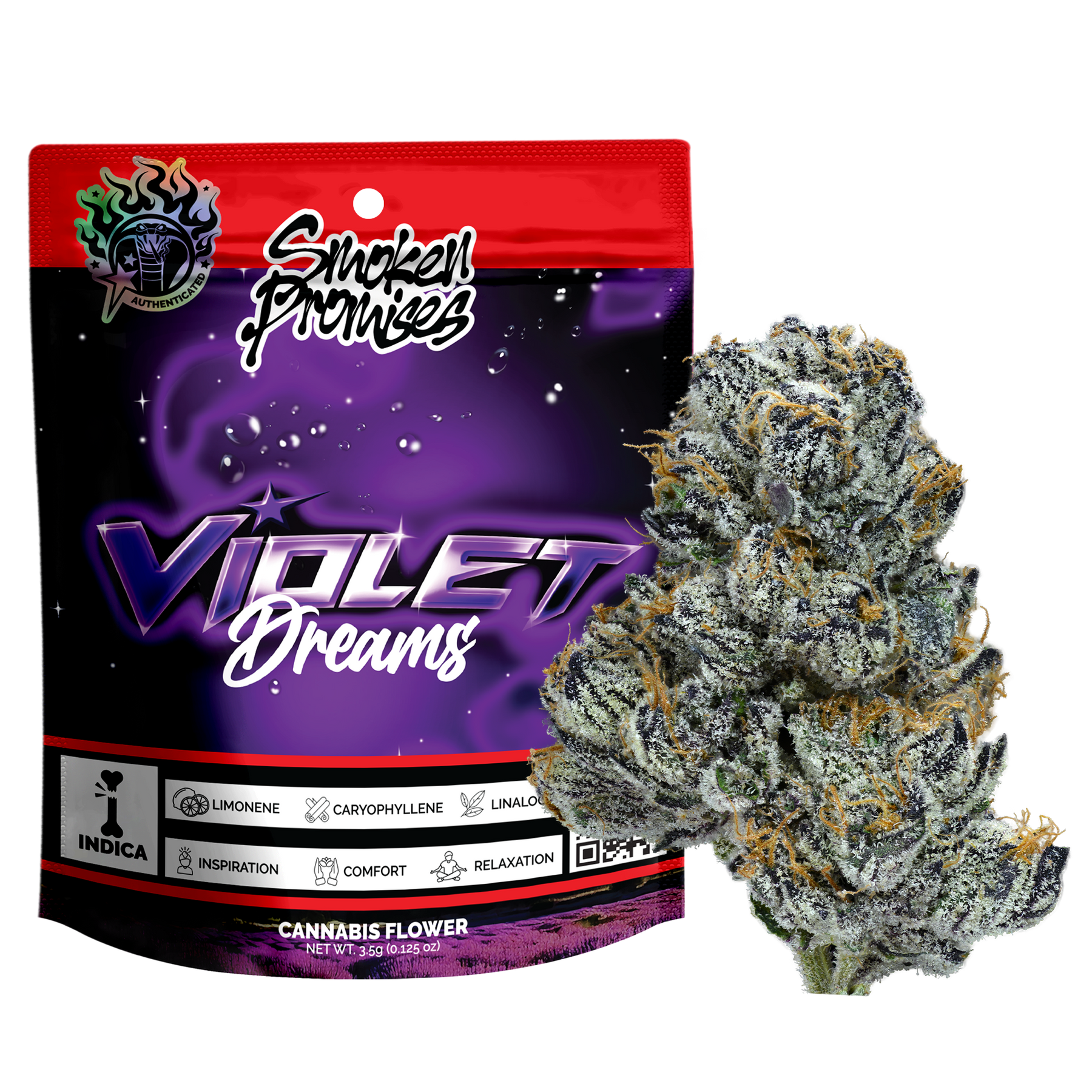 Experience a galaxy of flavor with Violet Dreams—this strain boasts dark purple hues and frosty, candy-like crystals that create a space-like visual experience. As an indica, it gently guides you into a dreamlike state, where sweet tastes and frost-covered nugs leave you questioning whether your experience is too good to be true. Prepare for an out-of-this-world journey as you embrace relaxation and comfort, puffing on this violet dream while your mind soars through the cosmos of bliss!